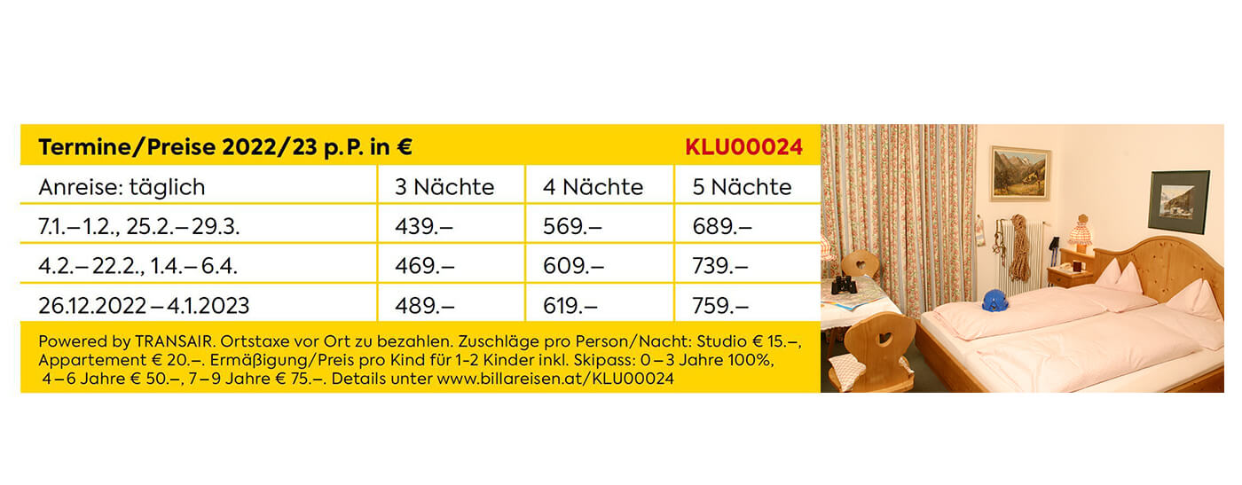 - Bitte geben Sie bei telefonischer Buchung den Reisecode KLU00024 an